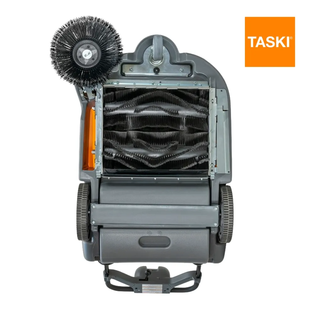 La TASKI balimat 2300 está diseñada para facility managers que requieren barrido eficiente en superficies diversas con autonomía extendida. Su sistema patentado Twin Roller (TRS) utiliza cepillos rotativos contrapuestos que transportan residuos desde el suelo hacia la tolva de 37 litros, completando la limpieza en una sola pasada. La batería 12V 50Ah proporciona hasta 3 horas de autonomía continua, eliminando limitaciones de cable en operaciones extensas.
