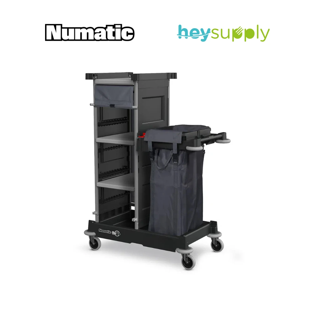 Carro de servicio Numatic NKS1R diseñado para responsables de housekeeping y coordinadores de lavandería en hoteles compactos, hospitales con áreas de servicio reducidas, residencias geriátricas de tamaño medio y centros deportivos que necesitan gestión eficiente de ropa sucia con capacidad 100L, almacenamiento versátil para suministros de limpieza y construcción sostenible certificada que garantiza durabilidad superior en ambientes de uso intensivo diario.
