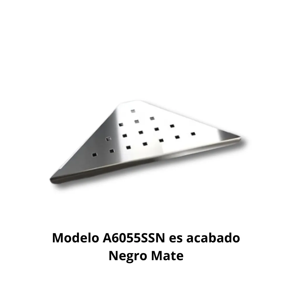 La construcción en acero inoxidable AISI304 proporciona resistencia mecánica y durabilidad extrema superior a latón o aleaciones en ambientes húmedos con contacto directo con agua, siendo esencial para instalaciones de alta frecuencia donde la resistencia a corrosión es prioritaria. El acabado negro mate proporciona una apariencia elegante y contemporánea que se integra perfectamente en baños con diseño moderno, minimalista o industrial, siendo ideal para hoteles boutique, restaurantes de alta gama o establecimientos con decoración oscura donde el negro mate comunica sofisticación y disimula huellas. El formato de esquina optimiza el uso del espacio aprovechando zonas habitualmente no utilizadas en duchas y bañeras. La construcción en chapa 1,0mm proporciona diseño limpio sin rejilla facilitando la limpieza.