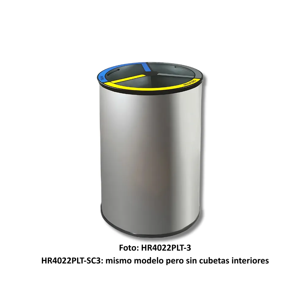 Los espacios públicos con separación selectiva que priorizan flexibilidad operativa y mantenimiento simplificado requieren soluciones que maximicen la capacidad útil sin elementos internos complejos. La HR4022PLT-SC3 presenta construcción chapa electrocincada con acabados colores personalizables y sistema de aros sujetabolsas en formato circular Ø465×860mm proporcionando 150L capacidad total para separación selectiva tripartita mediante bolsas diferenciadas, con peso optimizado de 11,9kg que facilita reubicación operativa.