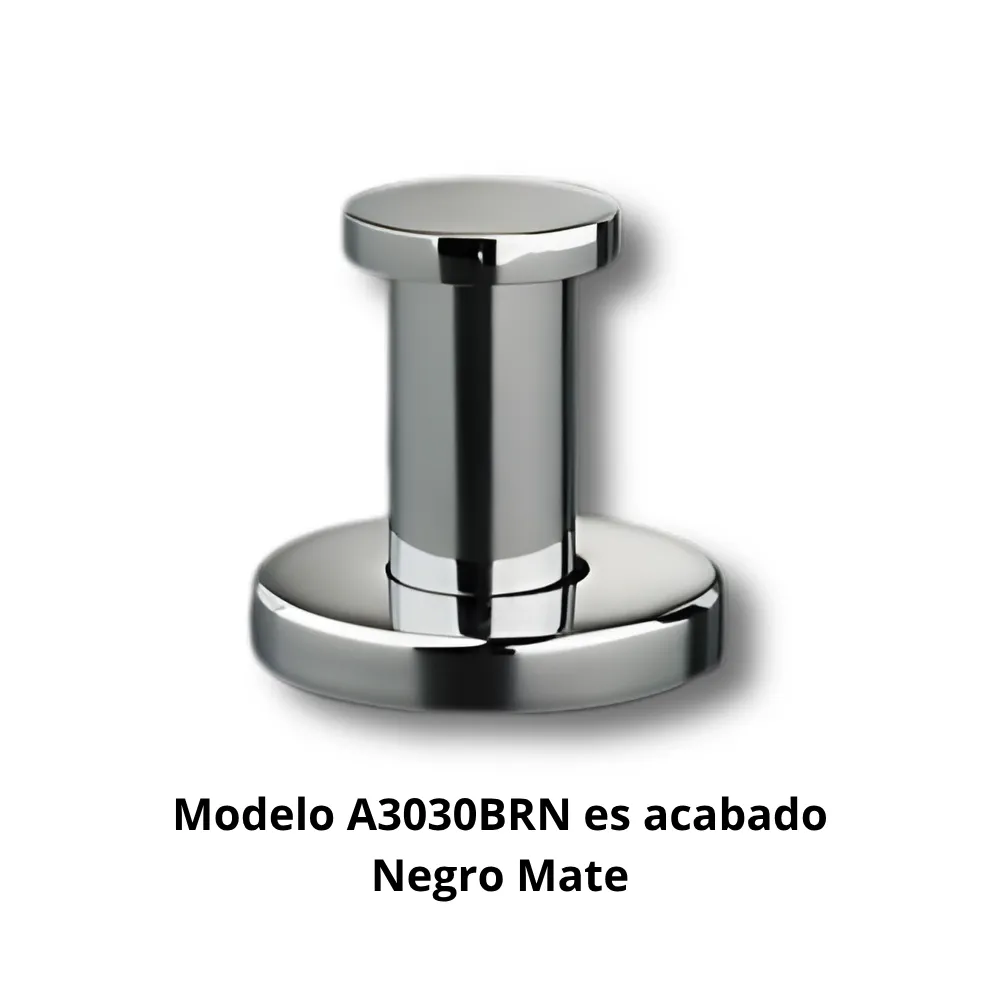 Los responsables de facilities en hoteles, restaurantes y colectividades que buscan perchas rectas de tapón para baños necesitan soluciones con construcción en latón con acabado negro mate y sistema antigiro. El modelo A3030BRN presenta una construcción de tubo de latón Ø20mm con espesor de 1,0mm, base de anclaje en aleación Zamac cincada, embellecedor en latón torneado Ø50mm con espesor de 2,0mm, acabado negro mate, sistema antigiro en la base que impide aflojamiento y descolocación, diseño de percha simple de tapón recta, dimensiones de 50×50×49mm, peso de 0,145kg, serie Carena, colocación sobre pared específicamente diseñado como percha recta profesional de tapón en latón negro mate para hoteles y restaurantes que demandan elegancia contemporánea con funcionalidad para colgar toallas, albornoces y otros textiles, con resistencia testada superior a 300 horas en cámara de nieblas salinas.