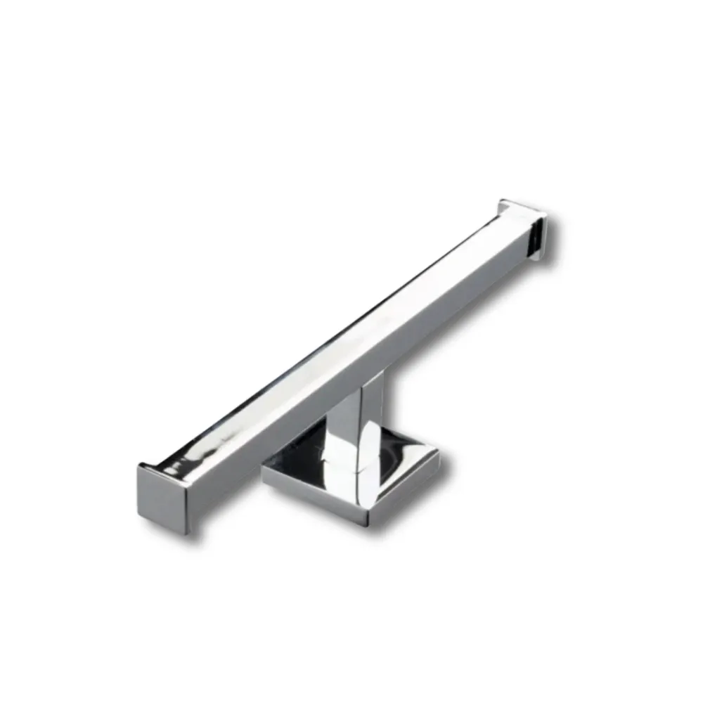 La construcción en tubo de latón cuadrado de 16×16mm garantiza resistencia mecánica superior y una estética moderna, mientras que el espesor de 1,0mm proporciona la robustez necesaria para soportar dos rollos de papel simultáneamente sin deformaciones. La base de anclaje en aleación Zamac cincada asegura una fijación sólida a la pared con resistencia a la corrosión, incorporando un sistema antigiro que impide el aflojamiento y descolocación del conjunto durante el uso intensivo. El embellecedor de latón torneado de 50×50mm con espesor de 2,0mm facilita la instalación desmontable, permitiendo acceso para mantenimiento preventivo mensual. El recubrimiento de baño de cromo de 0,40µm con acabado brillo pulido espejo ofrece una apariencia premium de alta gama que resiste el uso y mantiene su brillo. La resistencia a la oxidación superior a 300h testada en cámara de nieblas salinas garantiza durabilidad en ambientes húmedos sin degradación superficial.