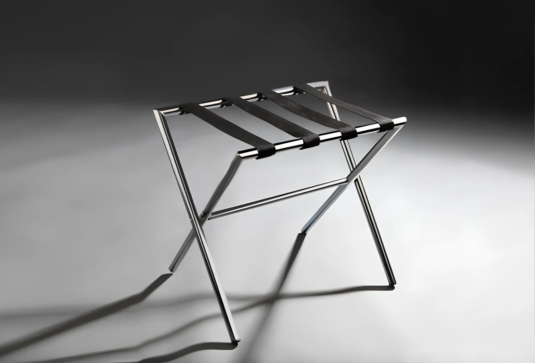 El soporte F4030CHP está desarrollado para habitaciones de hotel que requieren equipamiento funcional y resistente. Su estructura de tubo de acero redondo Ø25mm con espesor de 0,7mm garantiza la durabilidad necesaria para uso intensivo en establecimientos hoteleros. Las cintas de nylon de 50mm de ancho proporcionan una superficie antideslizante que protege las maletas de huéspedes.